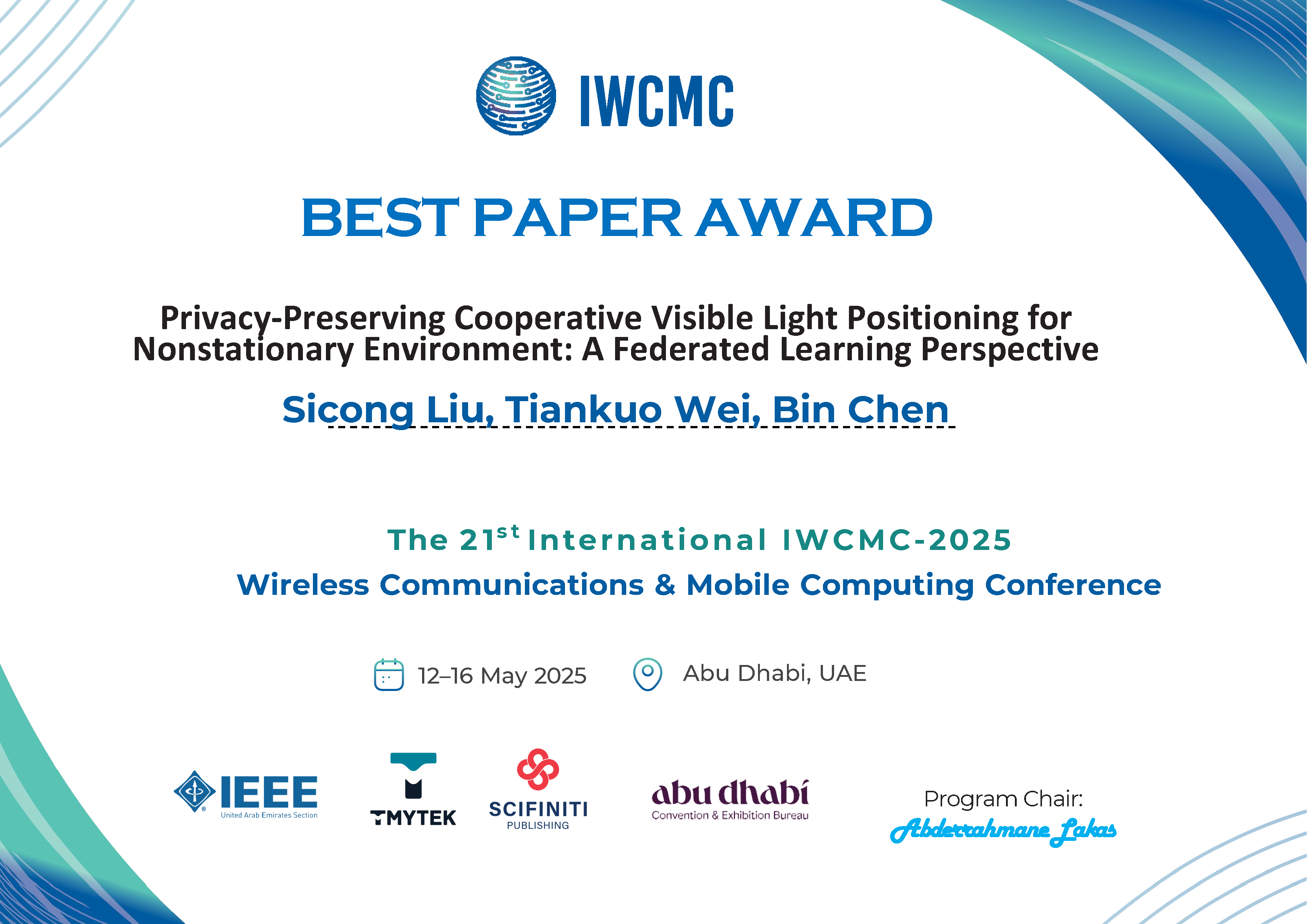 • S. Liu*, T. Wei, Bin Chen, "Privacy-Preserving Cooperative Visible Light Positioning for Nonstationary Environment: A Federated Learning Perspective," 2025 International Wireless Communications and Mobile Computing (2025 IEEE IWCMC), pp. 25-30, May 2025. [Abstract]